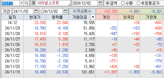 이건 사이냅 소프트의 기관과 외국인 매매동향이에요.